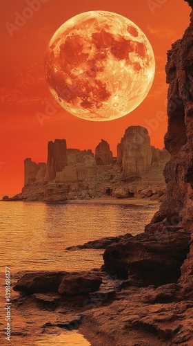 moon, orange, rock, ocean, water, coast, cliff, landscape, night, sky, nature, light, sea, stone, formation, coastline, dusk, evening, serene, tranquil, peaceful, scenic, lunar, celestial, astronomic, seascape, sunset, sunrise, horizon, atmospheric, dreamlike, fantasy, mystical, beautiful, idylli, romantic, travel, vacation, adventure, exploration, geology, erode, texture, solid, surface, rugged, jagged