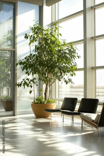 plant, large, green, leaf, tree, pot, brown, modern, chair, waiting, room, office, sunlight, window, bright, airy, roomy, floor, light, shadow, minimalist, interior, design, contemporary, elegant, serene, calm, peaceful, clean, polished