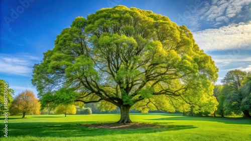 Large Platanus occidentalis tree towering above lush green grass lawn in a serene botanical garden with vibrant spring foliage