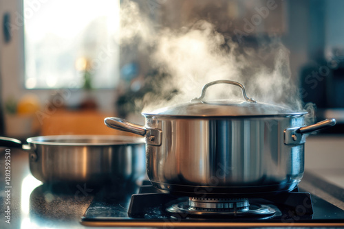 pot, water, stove, steam, kitchen, cooking, metal, heat, boiling, cookware, home, culinary, appliance, interior, gas, surface, shiny, modern, utensil, food, preparation, domestic, warm, cosy, environment, kitchen utensile, silver, container, lid, simmering, household, meal, boiling water, culinary arts