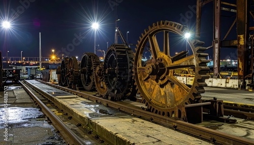 Large Rusty Gears and Cogs on Industrial Nighttime Dock Scene