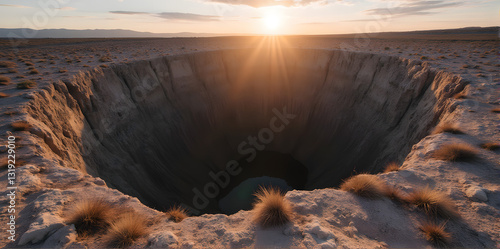 sinkhole, desert, landscape, sunset, crater, hole, abyss, pit, chasm, canyon, arid, dry, terrain, earth, ground, nature, outdoors, environment, geology, erosion, depth, huge, remote, isolated, sunlight, sun, horizon, scenic, travel, exploration, adventure, mystery, danger, emptiness, open, panorama, fisheye, perspective, geologic, natural wonder, land, surface, texture, rock, stone, sand, dry grass