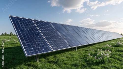 field, wildflower, solar farm, renewable energy, clean energy, green energy, solar energy, sustainability, nature, grass, landscape, technology, innovation, outdoors, countryside, blue skies, cloud, sunny day, ecology, environment, power generation, alternative energy, photovoltaic, renewable resources, electric power, solar panel, mountain, ocean, forest, river, lake, sky, climate, wilderness, green