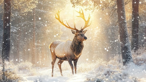 Large stag with luminous golden antlers standing among snow-laden trees, the quiet forest a backdrop to this majestic creature