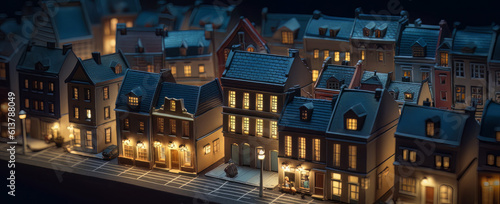 large street lights and houses in the city, in the style of miniature illumination, light gold and dark azure