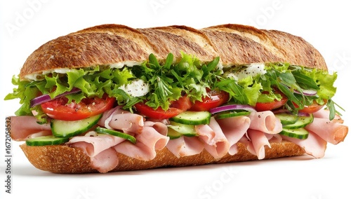 sandwich, sub, ham, deli, lunch, food, fresh, bread, long, delicious, tasty, healthy, vegetarian, salad, cucumber, tomatoes, onion, lettuce, cheese, protein, ingredient, balanced, meal, epicure, filling, freshness, whole grain, crust, crispy, layered, appetising, slice, deliciously, closeup, photo, studio, isolated, white, background, food photography, cookery, fast food