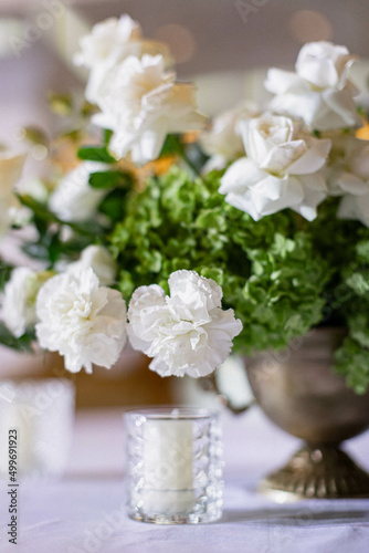Large white bouquets of roses stand on dinner tables decorated with golden glasses