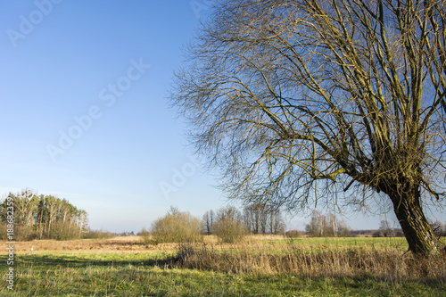 Large willow without leaves on a wild meadow