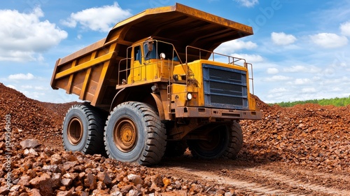 mining, truck, dump, heavy, machinery, construction, equipment, quarry, excavation, vehicle, industrial, yellow, rock, ore, extraction, industry, transport, large, offroad, work, shoveling, site, daytime, landscape, blue, sky, white, cloud, pile, tire, powerful, robust, hard-wearing, heavy duty