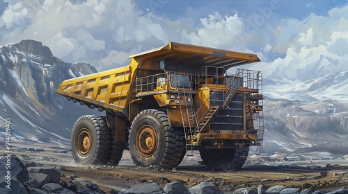 truck, mining, yellow, mountain, landscape, sky, cloudy, snow, capped, peak, large, vehicle, heavy, duty, haul, transport, ore, rock, gravel, earth, shoveling, quarry, construction, industry, machinery, equipment, industrial, powerful, huge, tire, wheel, cab, bed, bedside, exterior, dirt, road, ground, day, outdoors