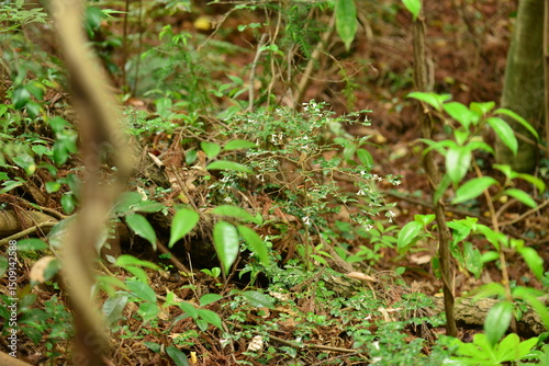 Lasianthus japonicus with spiny branches, white tubular flowers, and red berries. A native Korean medicinal shrub found in forest undergrowth.