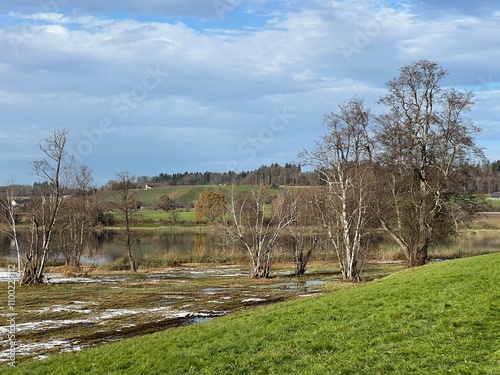Late autumn landscape and scenery in a park forest along the Swiss Katzenseen lakes or Katzensee lakes (Katzen lakes), Regensdorf - Canton of Zurich (Zürich or Zuerich), Switzerland (Schweiz)