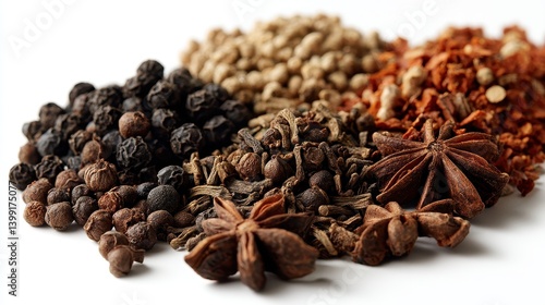 Lateral side view of popular Chinese spices like Sichuan peppercorns, Chinese cinnamon, star anise, and dried ginger, isolated on a white background, with a focus on their natural textures.