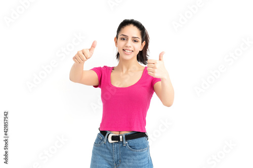 Latin woman pointing with fingers on white background