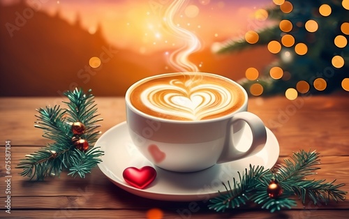 latte, hot drink, latte art, nubes, christmas, holiday, festive, tree, ornament, gold, red, bokeh, warm, cosy, mug, cup, wooden, light, foam, caffeine, drink, winter, celebration, love, romance, date, morning, breakfast