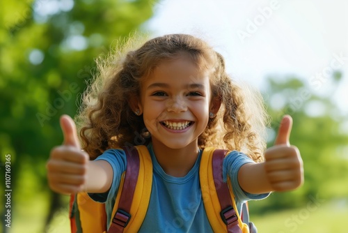 primary, school, girl, student, backpack, looking, camera, thumb up, sunny, day, blue, sky, outdoors, happy, children, laughing, curly, joyful, playful, confident, cheerful, smiling, children, education, fun, positive, energetic, carefree, childhood, young, excitement, bright, sunshine, nature, casual attire, portrait, enthusiasm, success, gesture, happiness, friendly, active, adventurous, youth, encouragement, thumb, up, signs