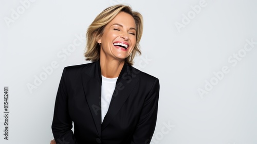Laughing mature businesswoman in black suit, joyful expression, isolated on white