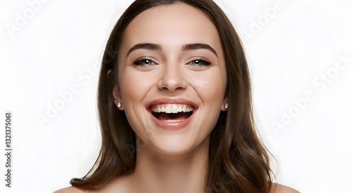 laughing, woman, young, european, brunette, brown hair, happy, joyful, smiling, cheerful, beauty, natural, face, closeup, white background, bright, happiness, female, model
