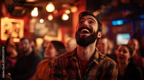 comedy, audience, performance, laughter, night, venue, entertainment, happy, gathering, joy, humor, bar, crowd, light, show, reaction, smile, expression, man, fun, music, atmosphere, cheerful, evening, live, excitement, people, social, enjoyment, camaraderie, culture, life events, nightlife, celebration, interaction, friends, connection, vibe, thrill, artist, comedian, chill, warm, festive, engagement, oneness, event, sharing