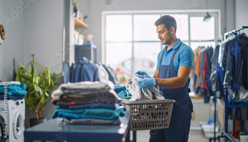 Laundry worker in uniform and gloves folding clean clothes beside a basket in a bright, organized laundry room with stacks of towels and garments, under soft natural lighting