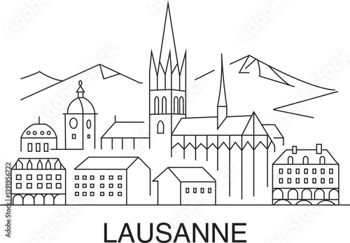 illustration, drawing, vignetting, design, landmark, background, city landscape, famous, destination, landscape, line, single line, print, banner, city, town, building, vector, architecture, travel, silhouette, skyline, concept, tour tourism, graphic, doodle, downtown, isolated, modern, abstract, lausanne, switzerland, europa, central europe, tower