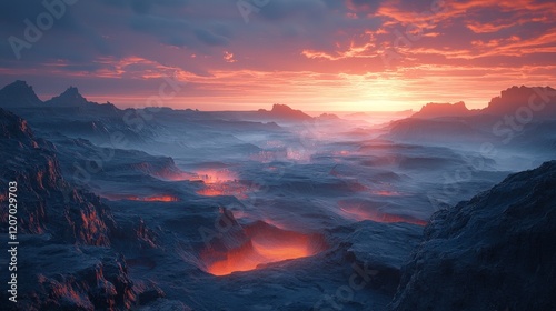 Lava flow eruption at dusk volcanic landscape digital artwork fiery environment atmospheric viewpoint nature's power