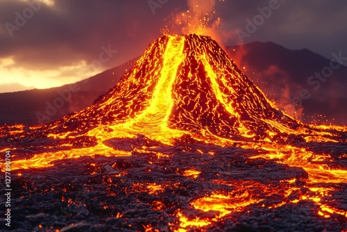 volcano, lava, eruption, sunset, nature, landscape, tropical, molten, rock, flowing, active, sky, heat, flames, smoke, geology, scenery, earth, mountain, magma, island, dramatic, illuminated, terrain, environment, beauty, spectacular, phenomena, natural, power, science, colours, geothermal, risk, explosive, flow, fiery, volcanic, formation, dusk, twilight, geologic, activity, stunning, view, generative, ai