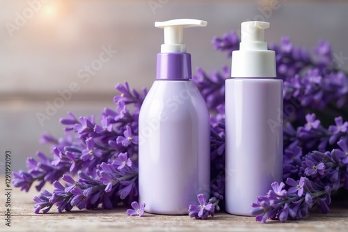 Lavender cosmetic products on wooden background with fresh flowers, wellness, cosmetics