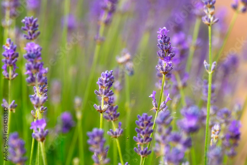 Lavender flowers blooming in sunny garden showcasing vibrant purple hues during mid-summer season