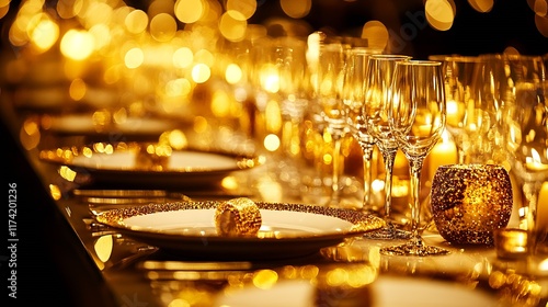 lavish, gold, tableware, luxury, elegant, formal, fine dining, stylish, decor, banquet, celebration, opulent, evening, regal, elite, fancy, exquisite, candlelit, plate, cutlery, glassware, napkin, posh, event, venue, party, glamour, sophisticated, sparkly, glowing, warmth, inviting, intimate, posh, refined, high-end, upscale, premium, festivity, occasion, opulence, ambience