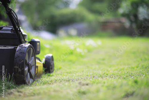 Lawn mover on green grass in modern garden. Machine for cutting lawns.