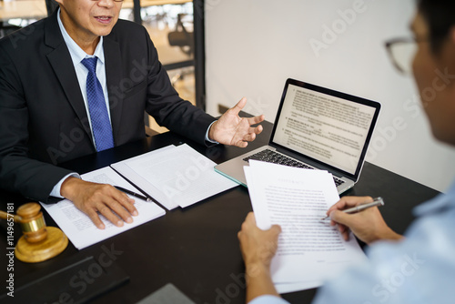 Lawyer Legal counsel presents to the client a signed contract with gavel and legal law. justice and lawyer Business partnership meeting concept.