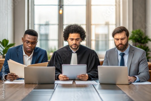 Lawyers reviewing and analyzing contracts to ensure compliance and client protection. (Law)