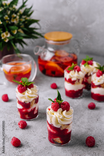 Layered dessert Trifle with vanilla cake, whipped cream and fresh raspberries