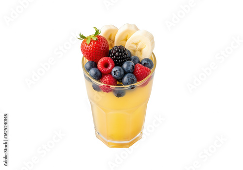 dessert, fruit, layered, white background, isolated, berry, strawberry, blueberry, raspberry, blackberry, banana, yogurt, pudding, sweet, treat, healthy, nourishment, diet, breakfast, snack, glasses, closeup, still life, topview, delicious, tasty, fresh, organic, food, vegan, vegetarian, summer, seasonal, culinary, cooking, receipe, styling, food photography, single object, cut-out, studio shot, composition, presentation, design element, no people, colourful