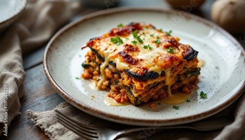 Layered eggplant lasagna with melted cheese and parsley on rustic plate