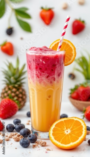 orange, strawberry, beverage, refreshment, glasses, straw, tropical fruit, pineapple, blueberry, blackberry, vibrant color, alimentary, healthy eating, wellness, diet, vegetarian, vegan, raw food, closeup, food photography, still life, studio shot