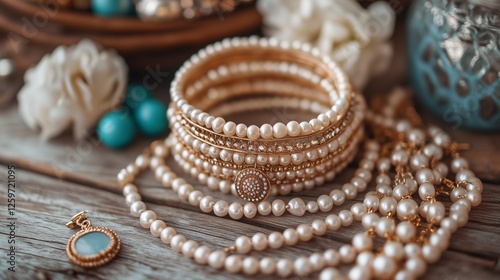 jewellery, bracelet, necklace, pearl, gold, cream, turquoise, bead, wooden, surface, accessory, fashion, luxury, elegant, beautiful, closeup, detail, woman, lady, style, vintage, indian, traditional, ornament, stacked, layered, string, decorative, stylish, jewellery, tone, pearl, floral, accent, light, brown, background, soft, lighting, element, fine, white, flower, collection, coloured