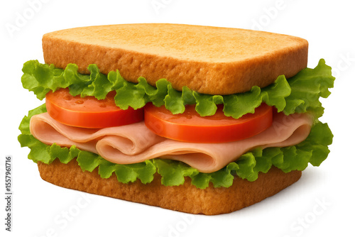 Layered ham sandwich with crisp lettuce, juicy tomato, golden-toasted bread, positioned on pristine white surface