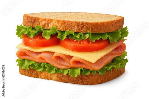 Layered sandwich featuring ham, cheese, tomato, lettuce nestled between crispy golden toasted bread slices, floating on clean backdrop