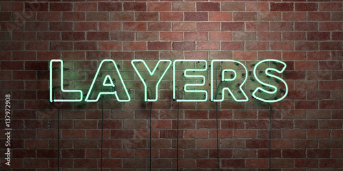 LAYERS - fluorescent Neon tube Sign on brickwork - Front view - 3D rendered royalty free stock picture. Can be used for online banner ads and direct mailers..