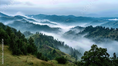Layers of hills fade into the distance under a blanket of morning fog, creating a dreamy mountain view.