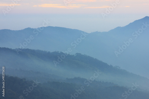 Layers of mountain covered with mist.