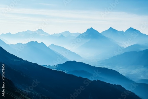 Layers of Mountain Peaks in Misty Hues of Blue and White Serenity Landscape Alpine Scenery