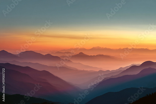 Layers of Mountains in a Colorful Sunrise Mist