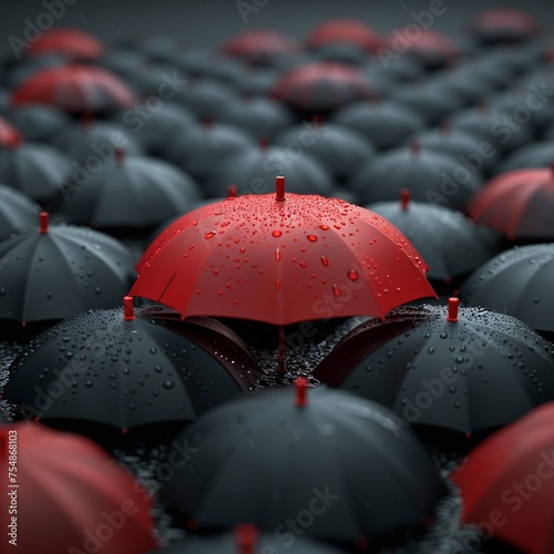 Leader in the Crowd Concept, Bulu, Red Umbrella Sneaks Up Against the Flow of Black Umbrellas. Beautiful 3d Animation, 4K. Made with generative ai