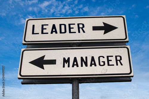 Leader vs manager. White two street signs with arrow on metal pole with word Leader and Manager. Directional road. Crossroads Road Sign, Two Arrow. Blue sky background.