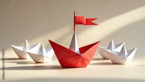 Leadership concept depicted with a red paper ship guiding among white ones.