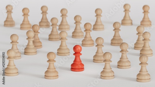 Leadership concept, red pawn of chess, standing out from the crowd of pawns.Leadership with business success concept. Made and rendered in C4D, not AI.