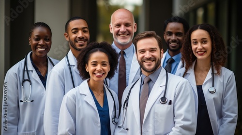 Leadership, teamwork and portrait doctors in hospital with support and success in healthcare. Health, help, and medicine, confident senior doctors happy medical employees smile together. Generative Ai